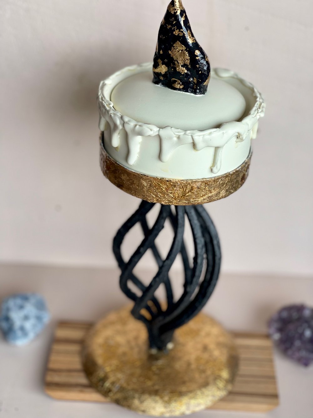 The base/holder has gold foil, sealed with glossy polyurethane, and the spiral part has added texture by using baking soda and black paint also sealed with matte polyurethane.