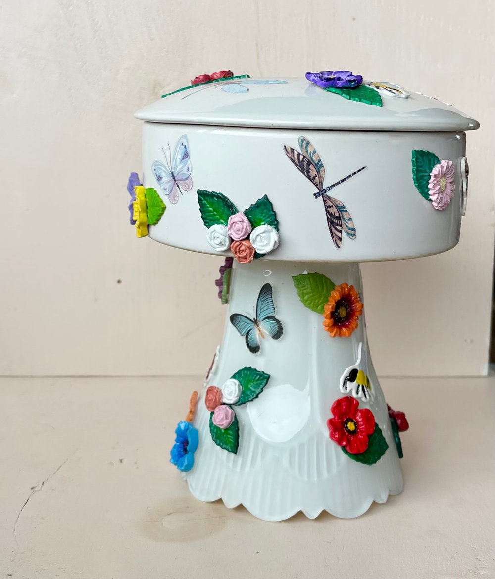Using a thrifted trinket dish, an old glass ceiling fan lightbulb shade, and some polymer clay I created this unique dish.