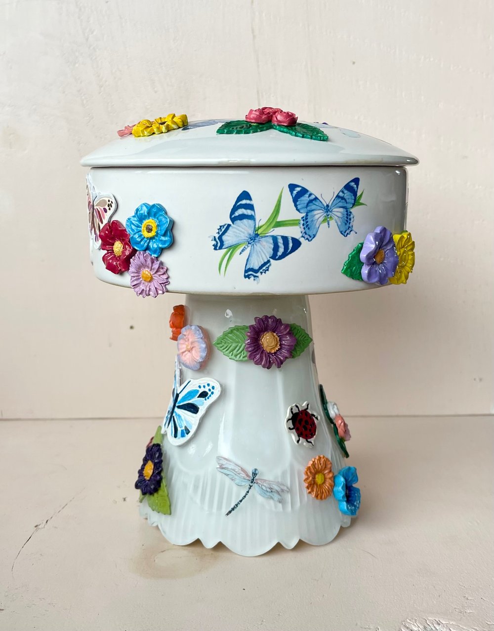 The flowers, bees, ladybugs, and leaves are all polymer clay I hand painted. The non blue butterflies and the dragonflies are stickers.