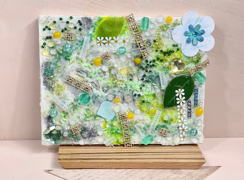 Messy and textured is how this piece would be described. But the eye cannot find one spot to focus on, much like an actual garden. All kinds of textures can be found, beads, glitter, fabric, paper, and plenty more. You can hang this this piece on any of its sides.