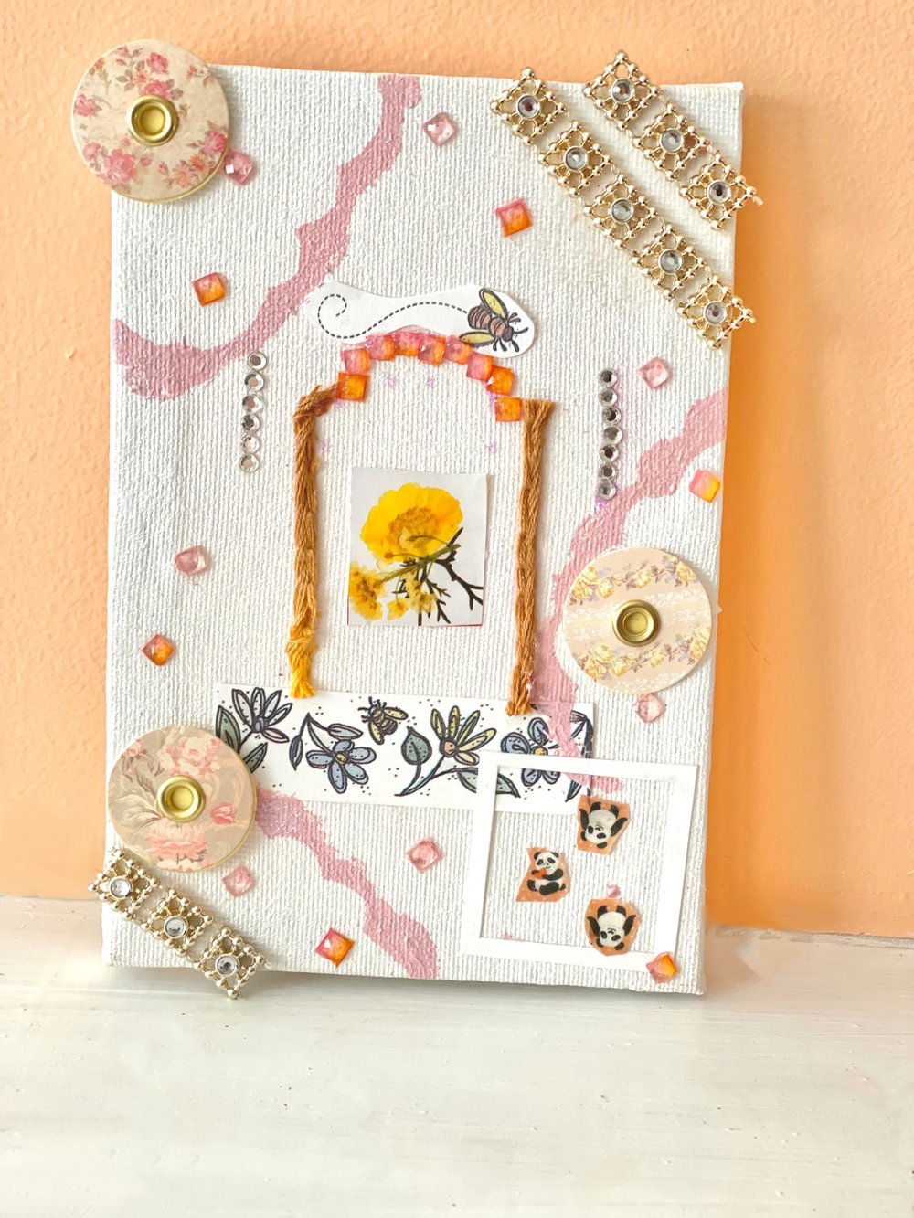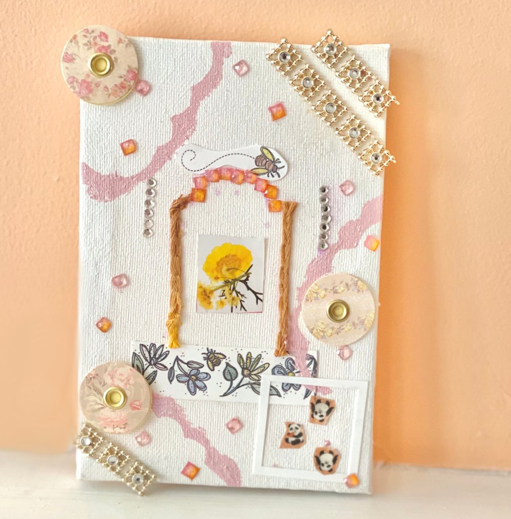 This is one of my original works of mixed media on canvas. it's a flower blossoming in a window looking out at the world and sky.